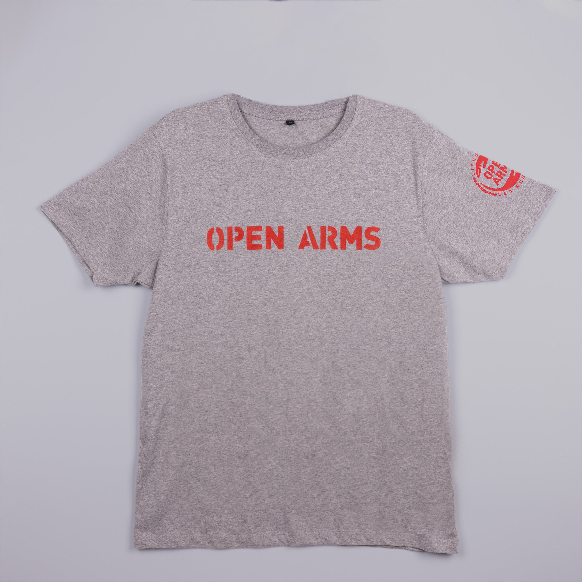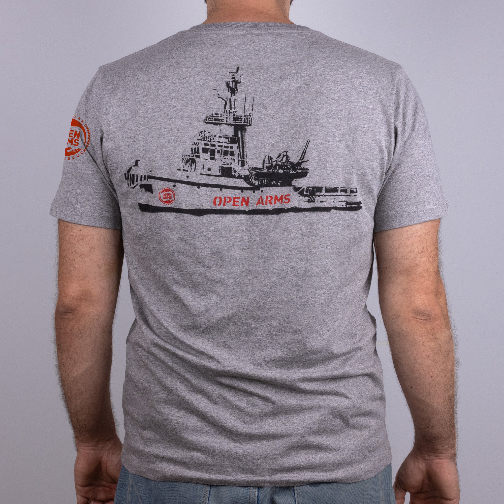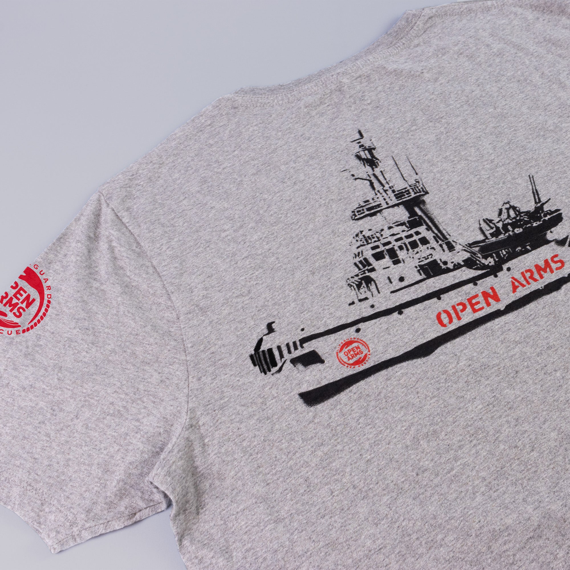 Samarreta unisex de màniga curta de color gris amb el vaixell d'Open Arms a la part posterior, i el logotip de la nostra organització a la part davantera de color vermell.