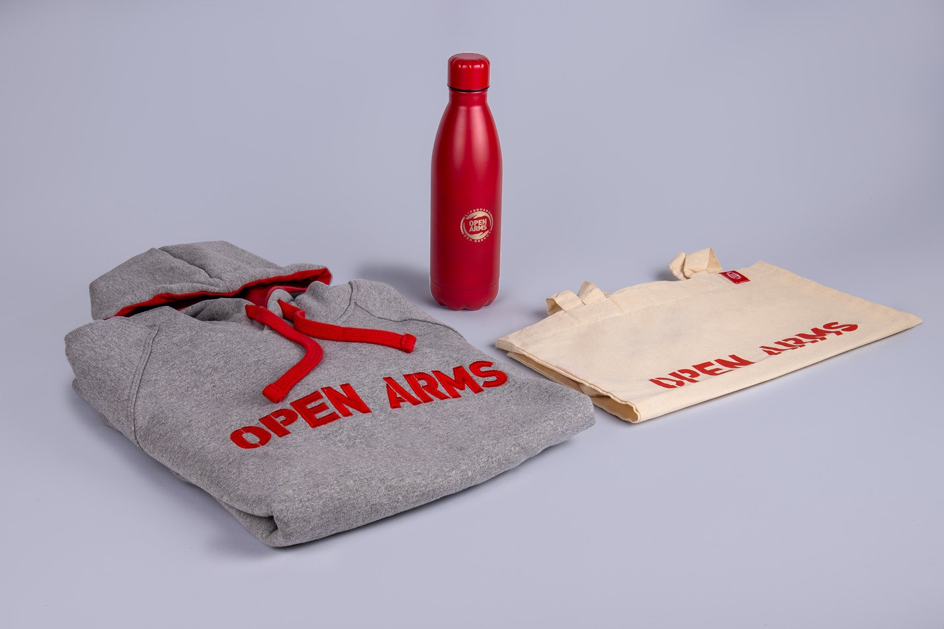Dessuadora grisa unisex amb caputxa i butxaca estil cangur, amb la paraula Open Arms brodada a la part davantera i el logotip de la nostra organització a la part del darrere.