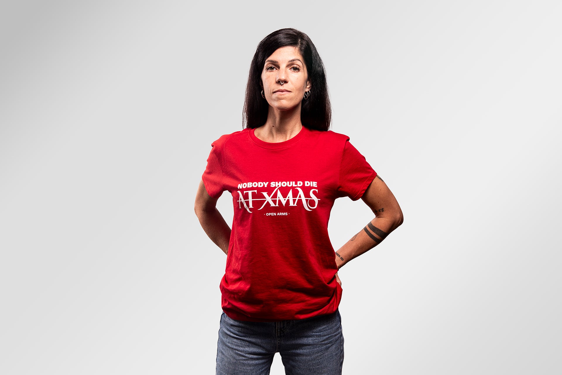 Unisex round neck, short sleeve t-shirt in red with a white print of the phrase “Nobody should die at Xmas.”