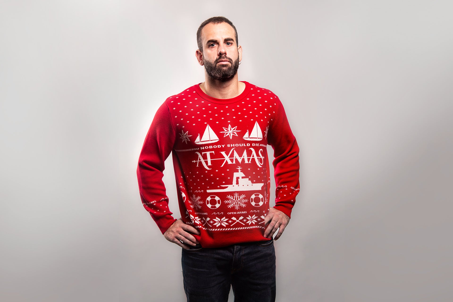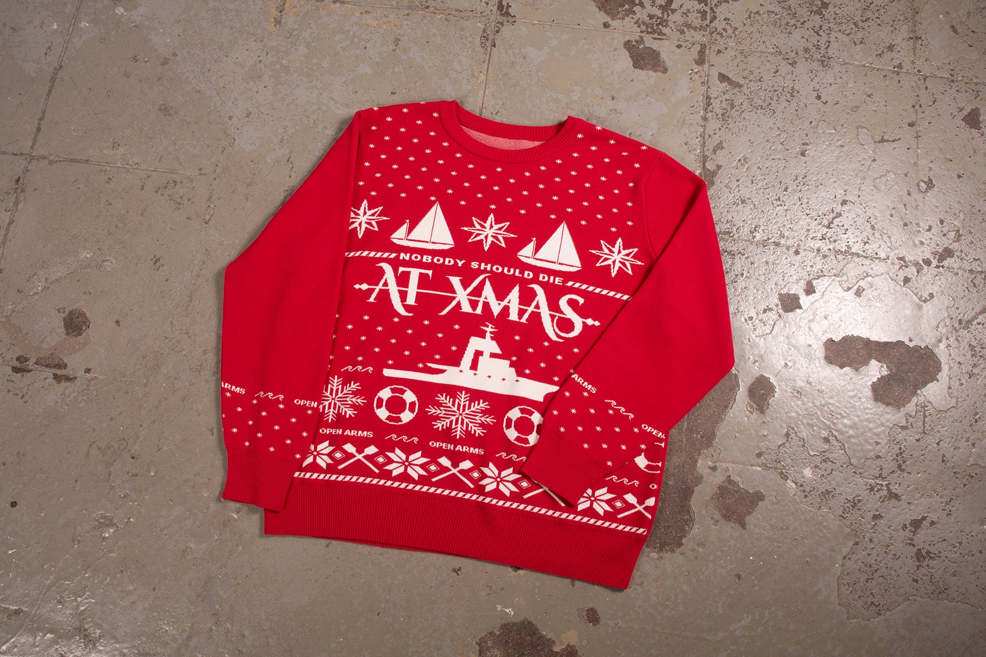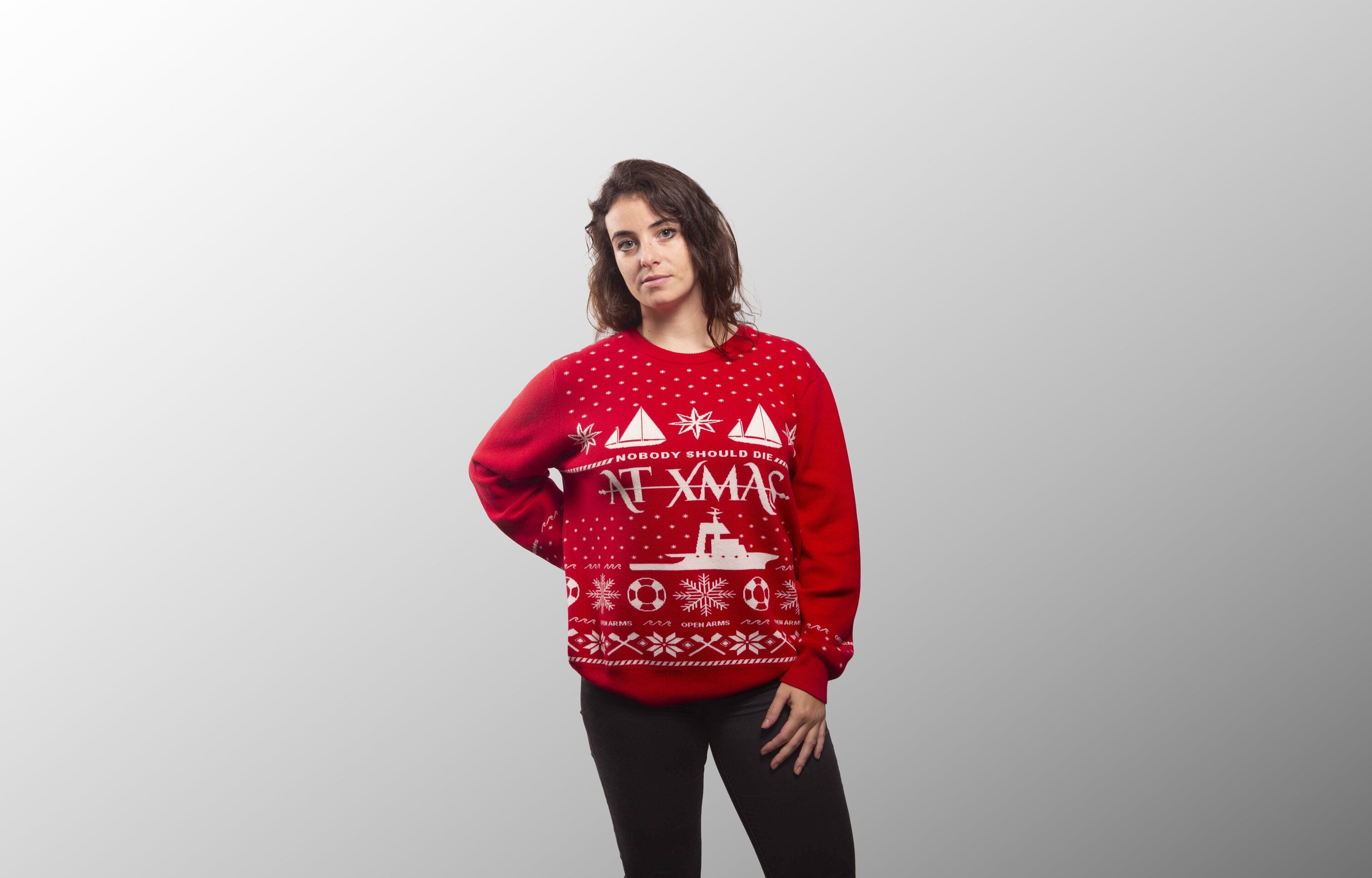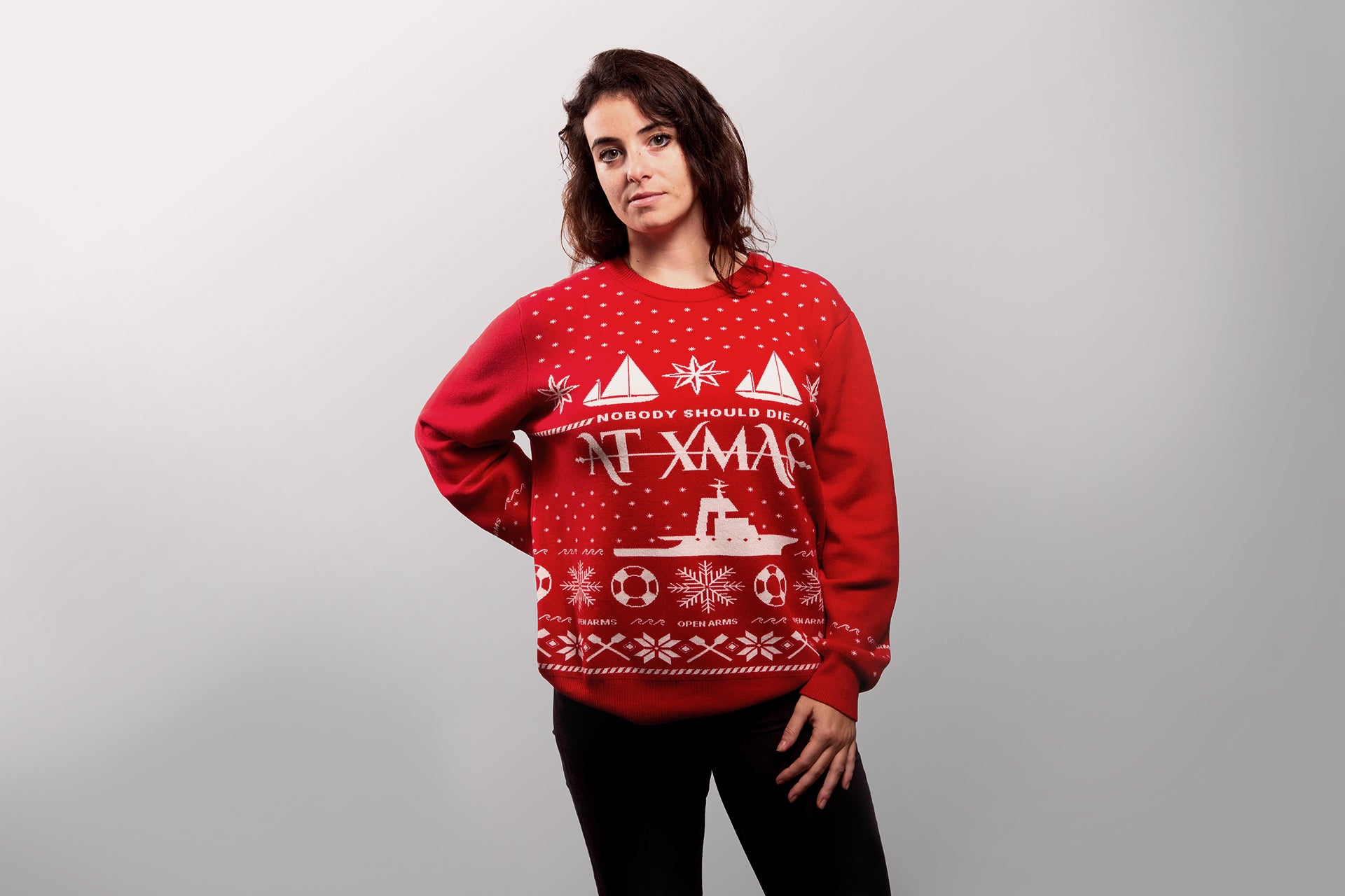 En portant ou en offrant notre pull de Noël local, vous nous aidez à mener à bien notre 107e mission à bord de l'Open Arms : la mission de Noël. Car, malheureusement, Noël n'efface pas la dure réalité du quotidien en Méditerranée.