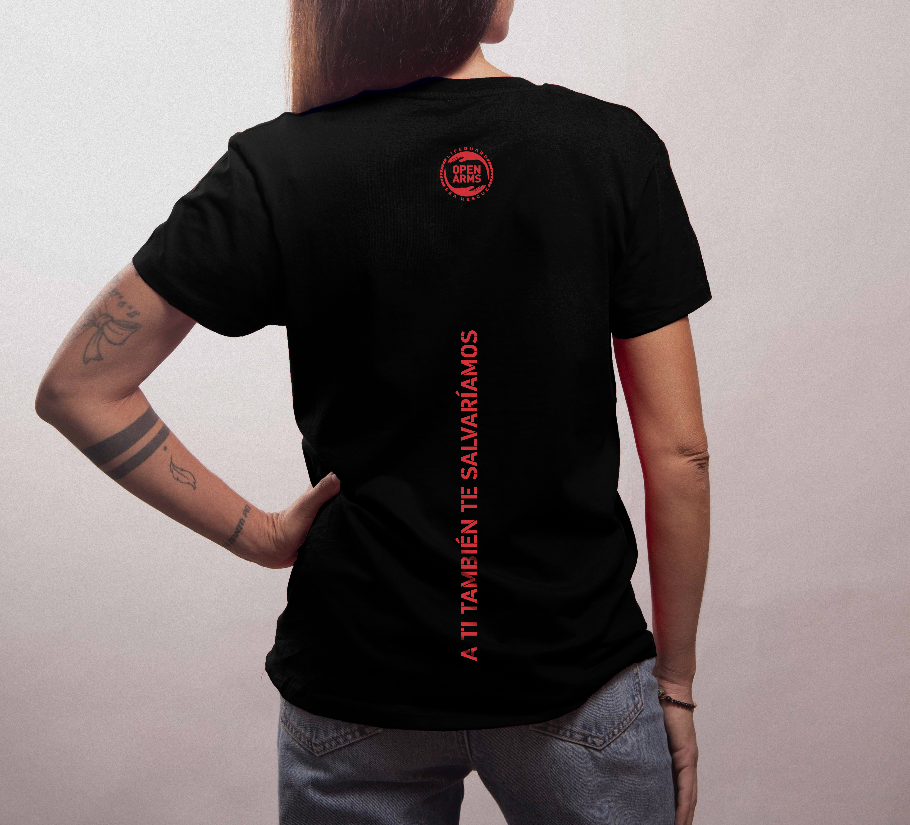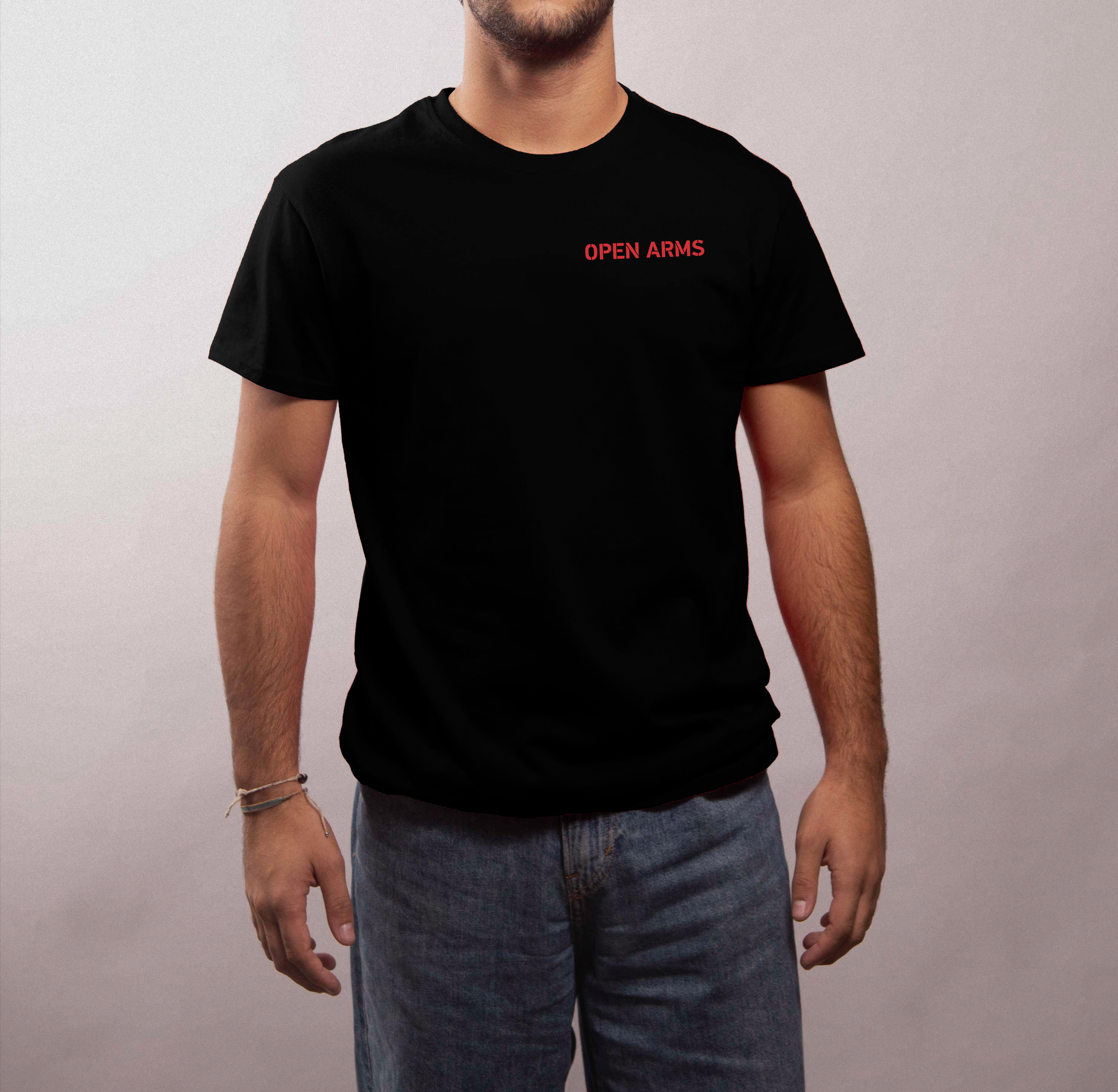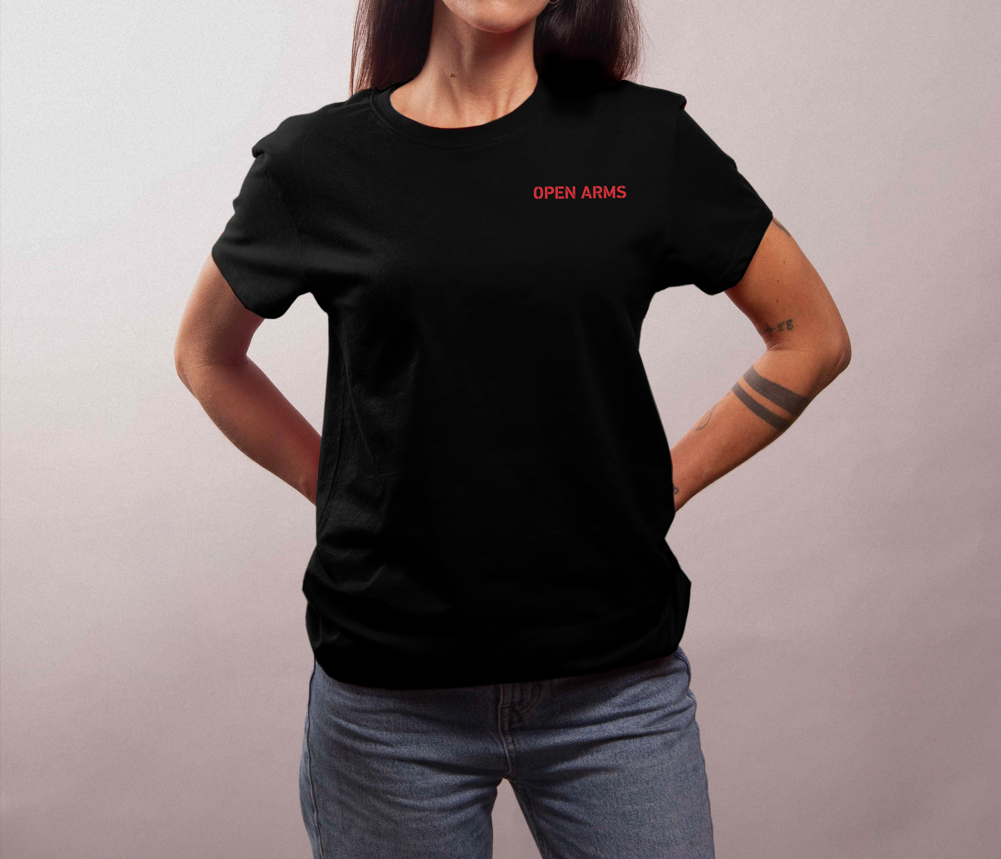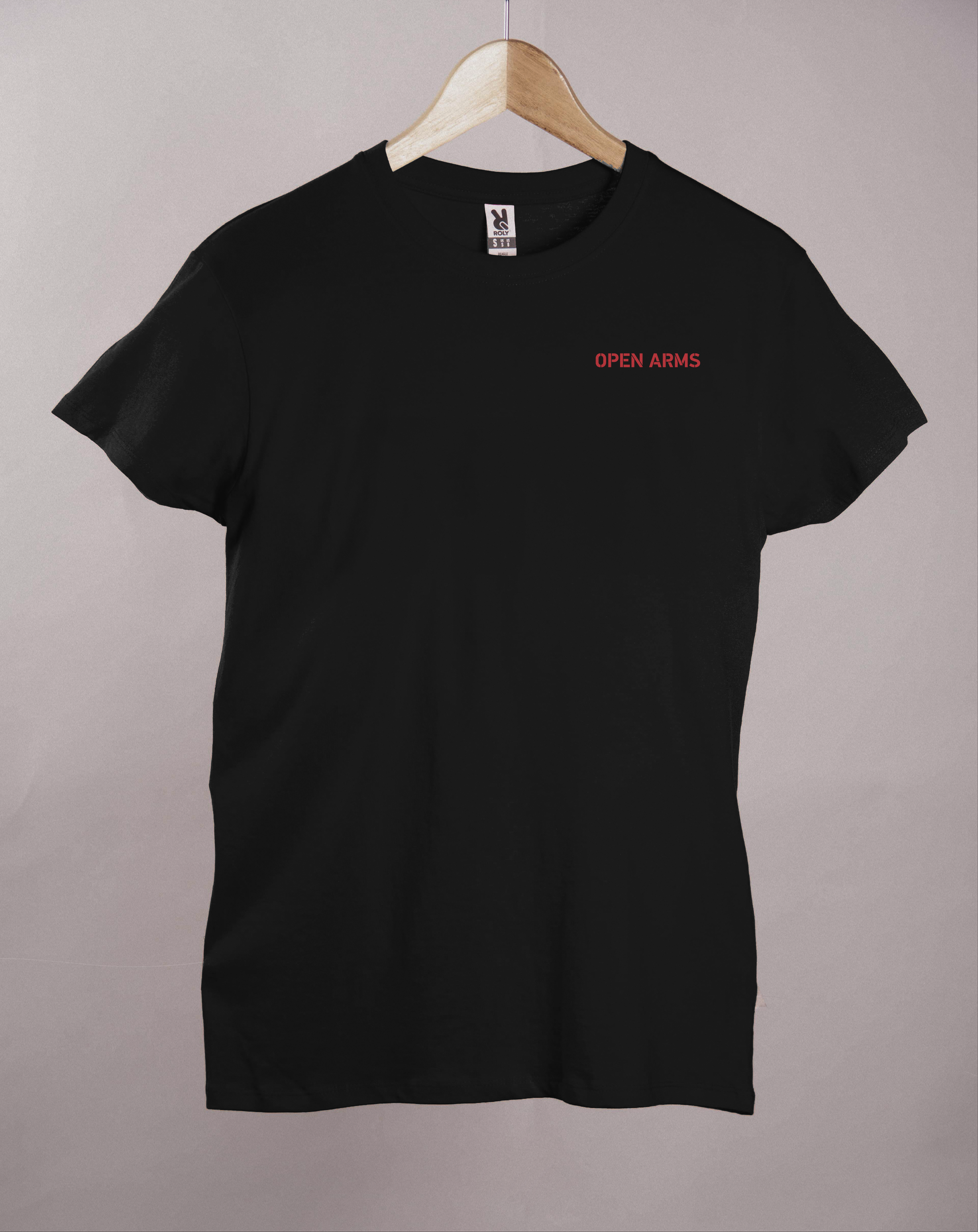 T-shirt unisexe à manches courtes et col rond avec un imprimé « Open Arms » sur le devant et la phrase « We would save you too » sur le dos.