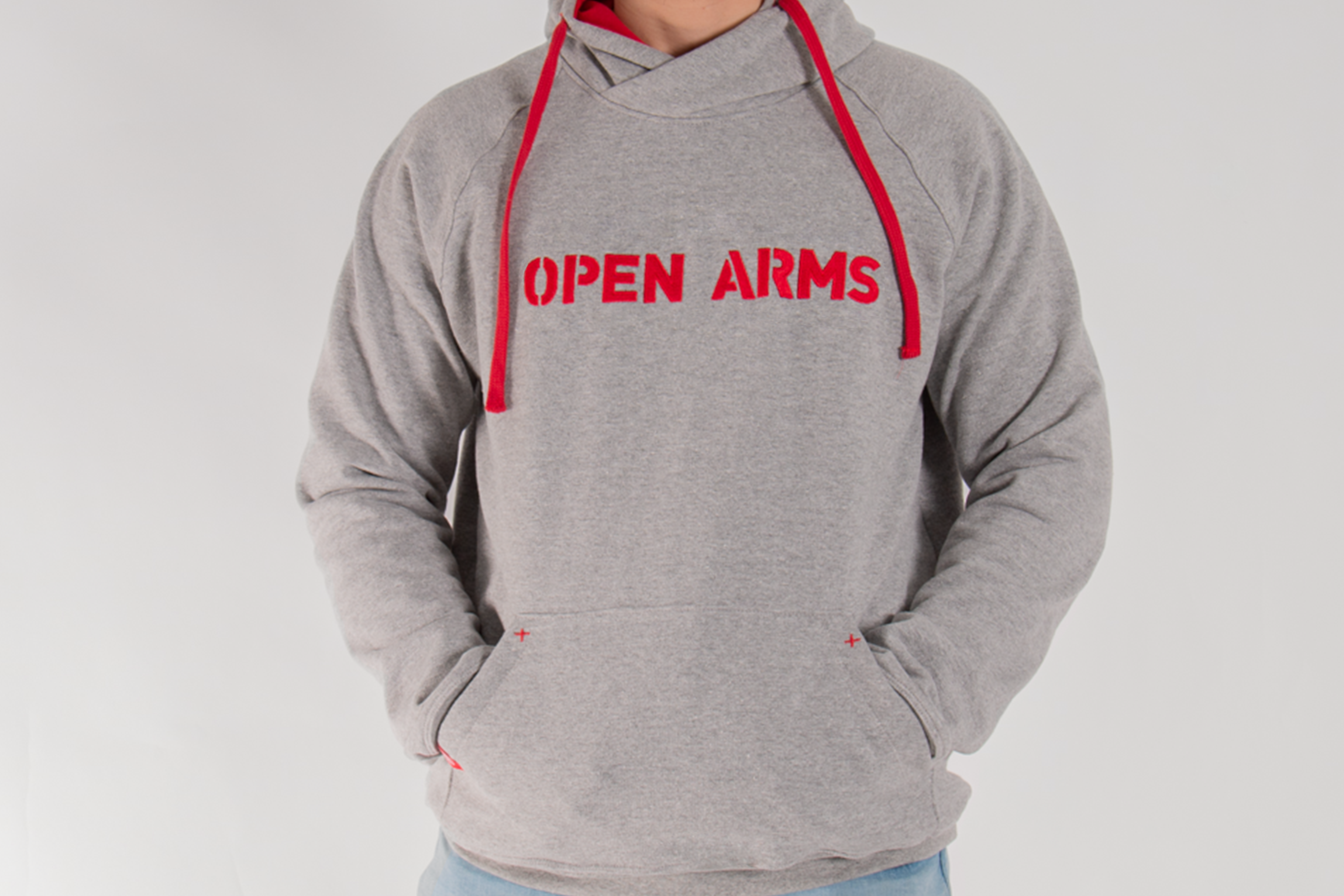 Sudadera gris unisex con capucha y bolsillo estilo canguro, con la palabra Open Arms bordada en la parte delantera y el logo de nuestra organización en la parte trasera.